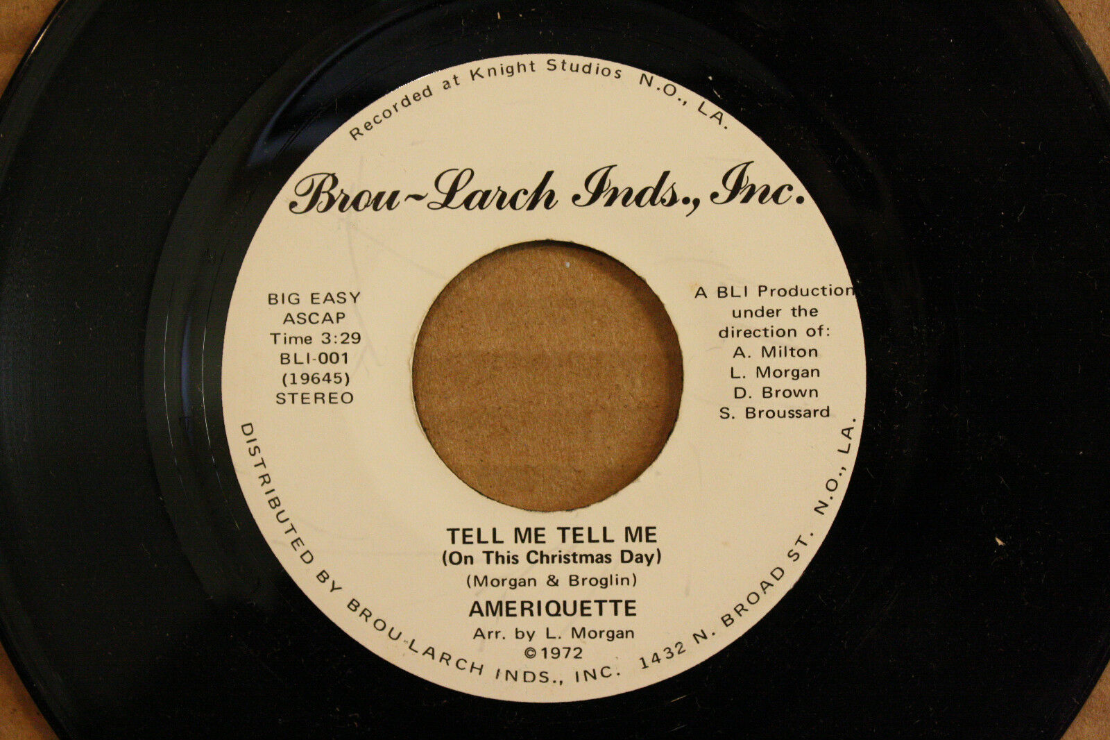 New Orleans Soul / Christmas 45. Ameriquette "You Are Life" (3:06) B side: "Tell Me, Tell Me (On This Christmas Day)" (3:29) BROU-LARCH INDS, INC. 001 Label: VG++ (as shown) Record: VG+ (light surface marks, light pops, records were boxed w/o sleeves, clean copy)