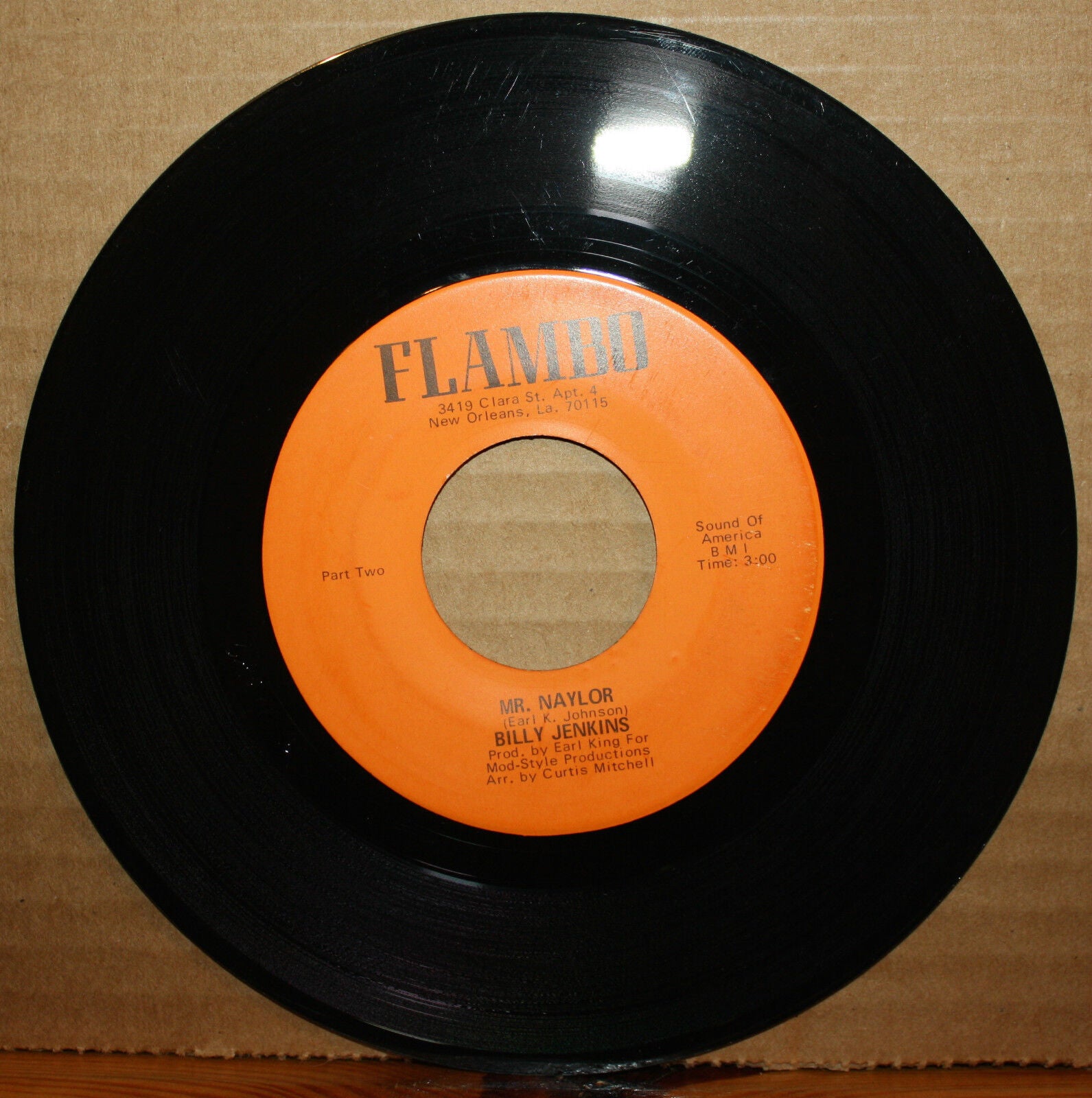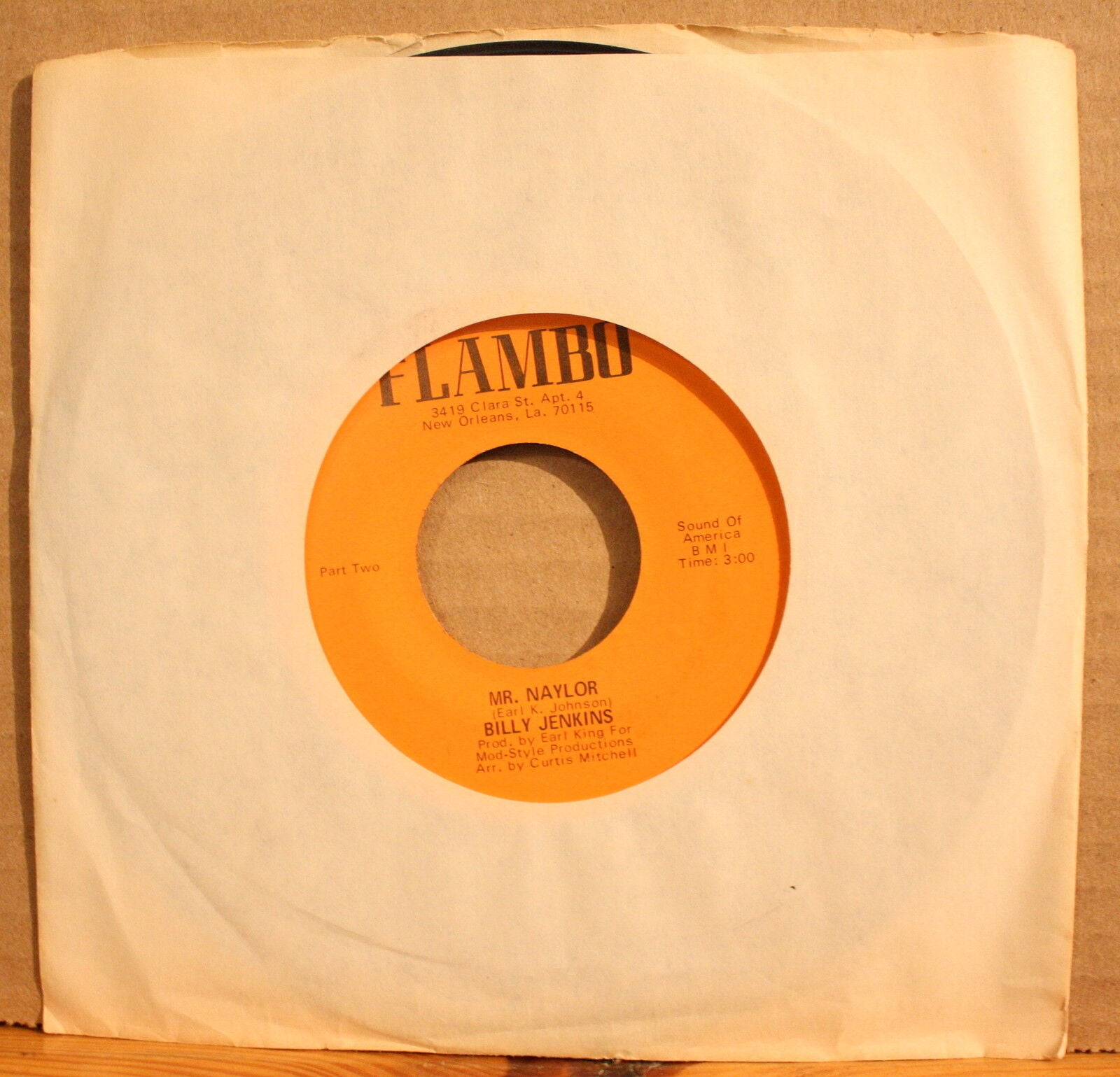 New Orleans Soul 45. Billy Jenkins "Mr. Naylor (Part one)" (3:41) B side: "Part Two" (3:00) FLAMBO 52671 (GREAT SONG produced by Earl King) Label: EX (as shown) Record: EX-(light surface marks, never played)
